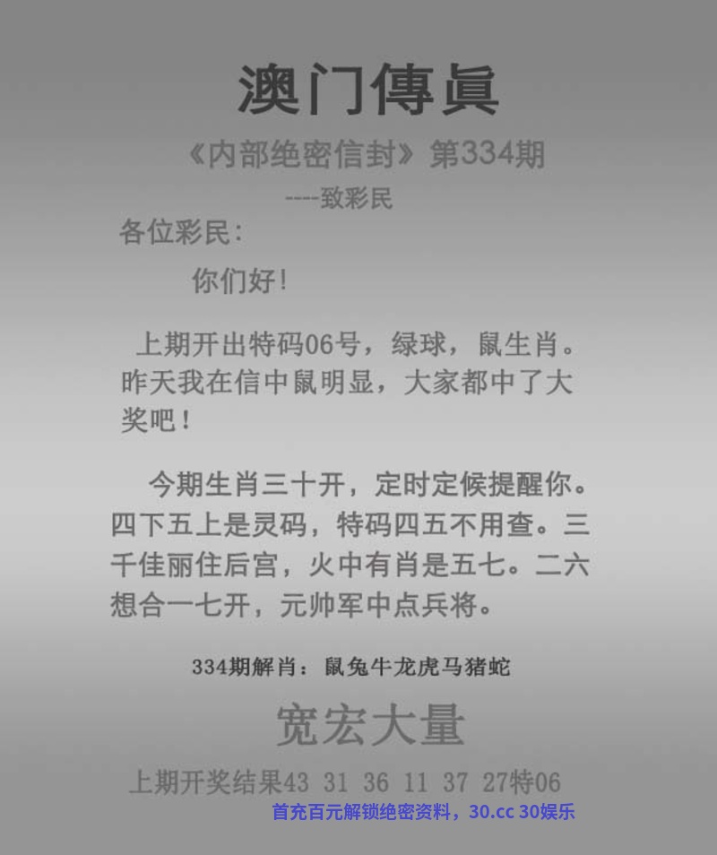 | 334期精解传真: 今期生肖三十开,定时定候提醒你。 四下五上是灵码,特码四五不用查。 三千佳丽住后宫,火中有肖是五七。 二六想合一七开,元帅军中点兵将。 宽宏大量 解:今期四下五上是灵码,解四头特码40-49,火中有肖是五七,解火肖蛇马。 综合:鸡蛇鼠兔牛羊虎猴狗 |
