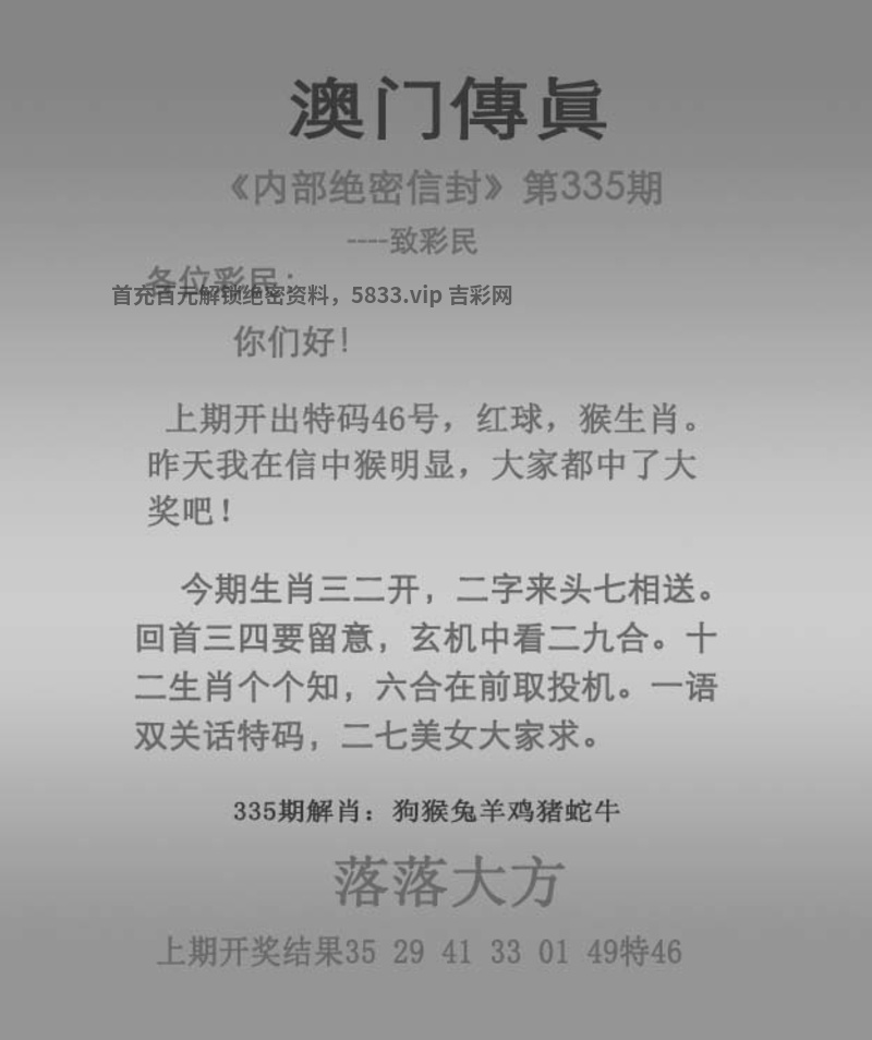 | 335期精解传真: 今期生肖三二开,二字来头七相送。 回首三四要留意,玄机中看二九合。 十二生肖个个知,六合在前取投机。 一语双关话特码,二七美女大家求。 落落大方 解:今期生肖三二开,解大数特码25-49,一语双关话特码,解双肖虎鼠狗猴马龙。 综合:兔鸡牛马猴狗猪虎蛇 |