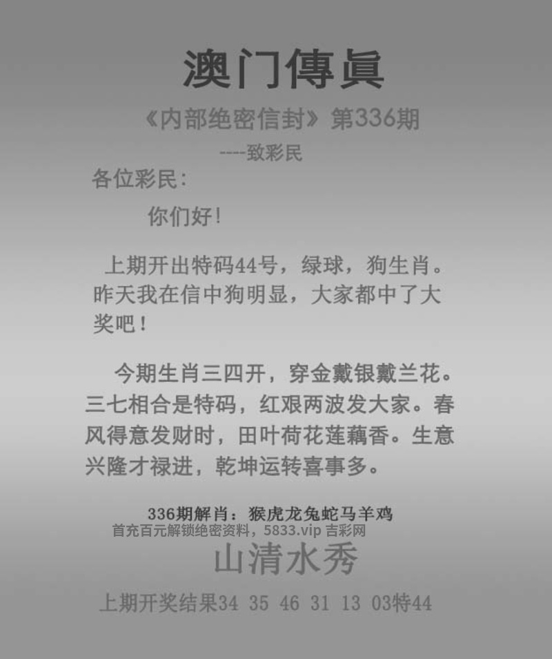| 336期精解传真: 今期生肖三四开,穿金戴银戴兰花。 三七相合是特码,红艰两波发大家。 春风得意发财时,田叶荷花莲藕香。 生意兴隆才禄进,乾坤运转喜事多。 山清水秀 解:今期三七相合是特码,解单肖兔牛猪鸡羊蛇,红艰两波发大家,解红波。 综合:龙蛇牛狗马羊鼠虎鸡 |