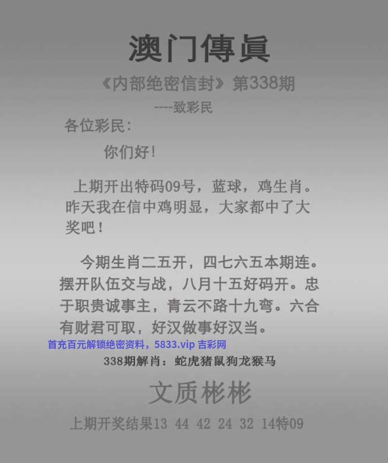 | 337期:开奖结果:13-44-42-24-32-14特:鸡09准 | |||||||||||